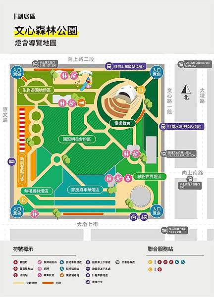共規劃生肖遊園地、熱帶叢林、節慶嘉年華、繽紛世界、國際明星會五大燈區,